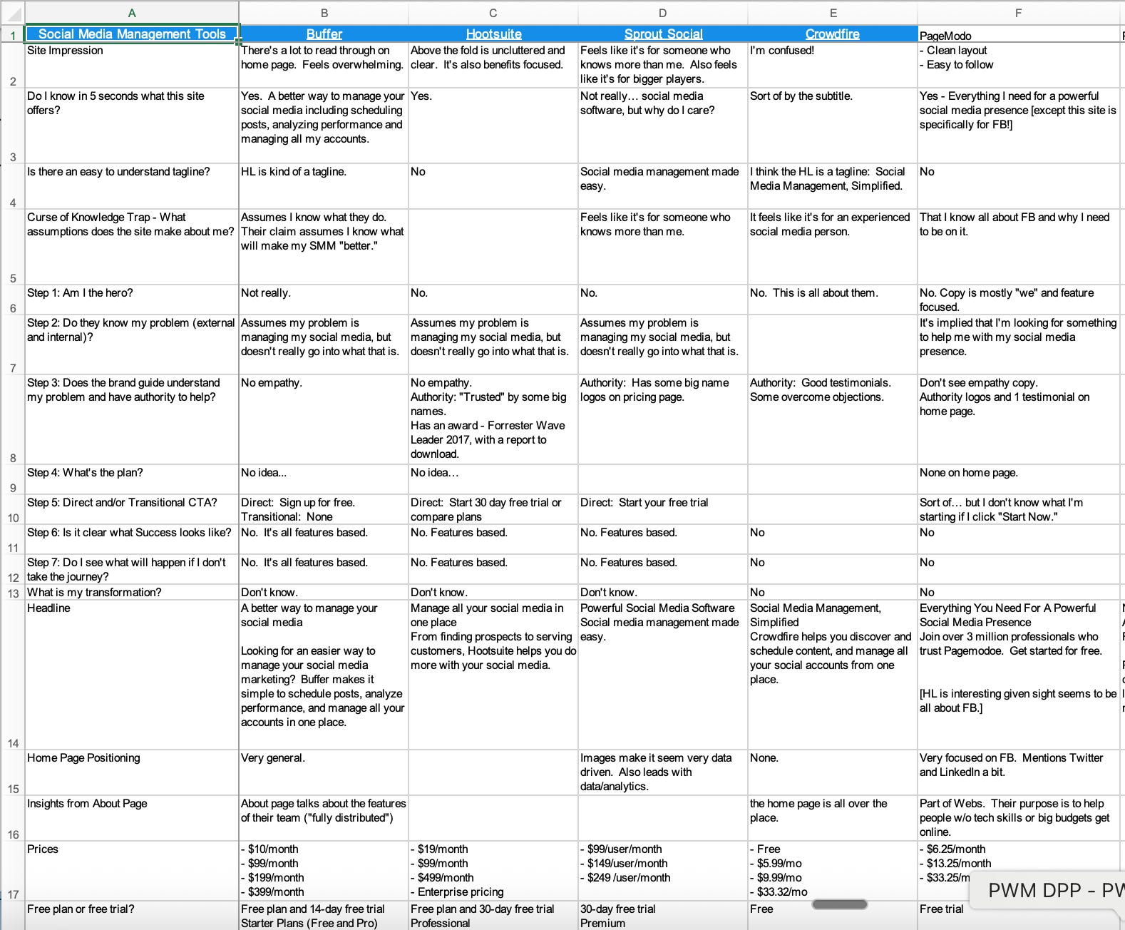 The first thing I did was research the market. I got a list of 22 competitors and analyzed them all. I put together a detailed spreadsheet that laid out all of their market positioning, their website headlines, and all the details of their offer.